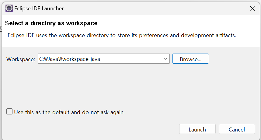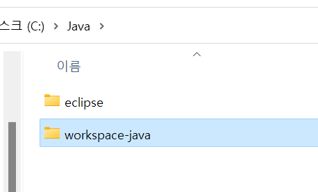 아까 만들었던 JAVA 폴더에 workspace-java 폴더 하나 더 만들어서 그곳에 저장하도록 지정 할 예정입니다.