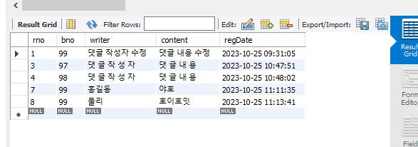 ๋๊ธ ํ ์ด๋ธ 1. rno : ๋๊ธ ๊ณ ์ ๋ฒํธ 2. bno : ๊ฒ์๋ฌผ ๊ณ ์ ๋ฒํธ 3. writer : ๋๊ธ ์์ฑ์ 4. content : ๋...