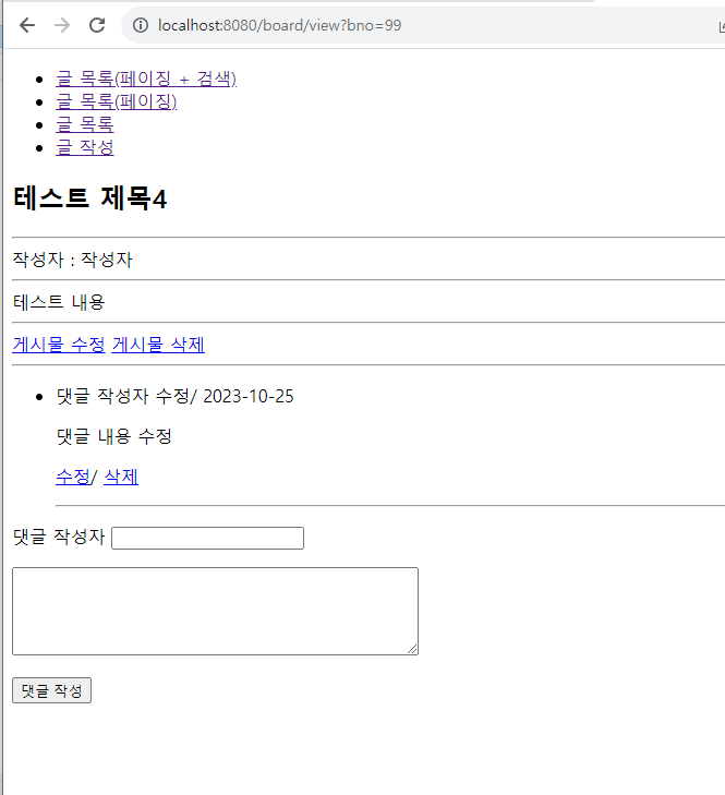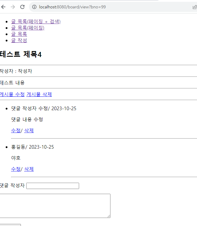 | ๊ฒ์ํ ๋ง๋ค๊ธฐ - ๋๊ธ DB์ ํ ์ด๋ธ ์ถ๊ฐ, ๊ฒ์๊ธ ๋๊ธ ์กฐํ (0) | 2023.10.25 |