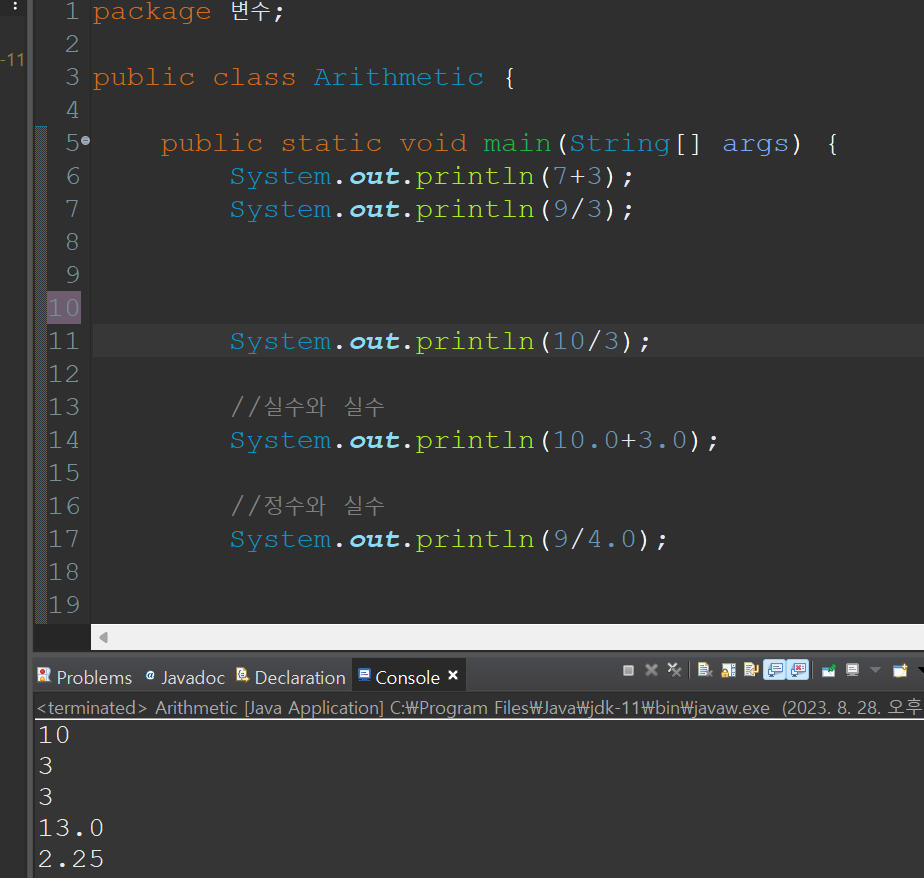 실수와 정수가 혼합해서 산술하는 경우에는 byte수가 더 높은 실수를 기준으로 출력됨.