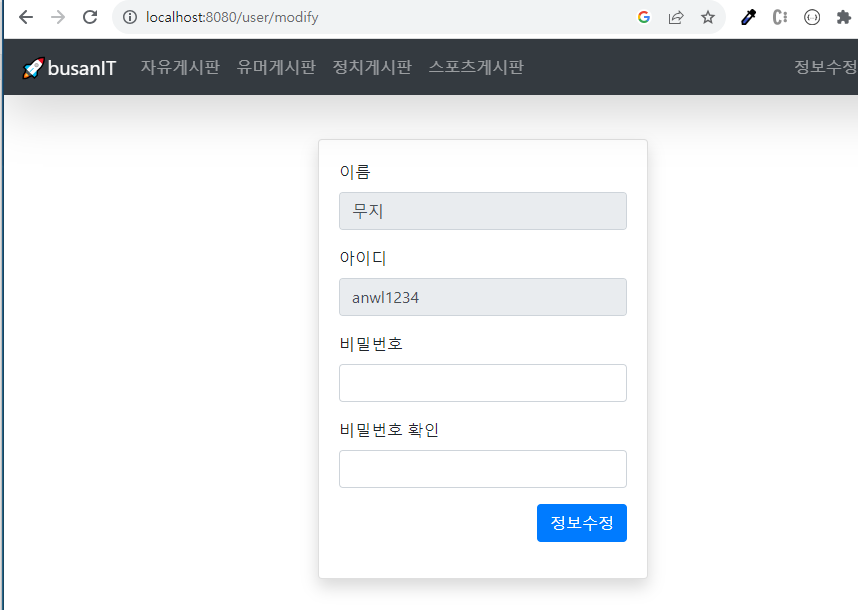 ์ปจํธ๋กค๋ฌ์์ modifyUser๊ฐ์ฒด๋ฅผ ๋ด๋ ค์ค์ผํจ