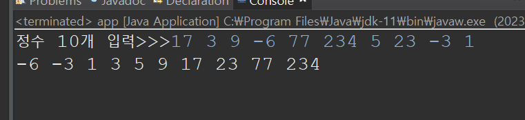 문제 ) 정수 10개를 입력받아 배열에 저장하고 증가 순으로 정렬하여 출력하라.