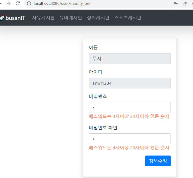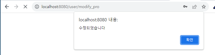 ๋น๋ฐ๋ฒํธ๊ฐ ๊ฐ์ง ์์ผ๋ฉด ๋ฉ์ธ์ง์ํจ๊ป modify ํ์ด์ง๋ก ์ด๋