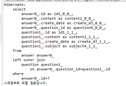 System.out.println(a.getQuestion().getSubject()); //a๋ต๋ณ์ ํด๋นํ๋ ์ง๋ฌธ์ ์กฐํํ์ฌ, ์ ๋ชฉ์ ๊ฐ์ ธ์จ๋ค.