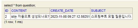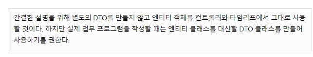 우리가 작성한 Question, Answer 클래스는 엔티티(Entity) 클래스이다. 엔티티 클래스는 데이터베이스와 직접 맞닿아 있는 클래스이기 때문에 컨트롤러나 타임리프 같은 템플릿 엔진에 전달하여 사용하는 것은 좋지 않다. 컨트롤러나 타임리프에서 사용하는 데이터 객체는 속성을 변경하여 비즈니스적인 요구를 처리해야 하는 경우가 많은데 엔티티를 직접 사용하여 속성을 변경한다면 테이블 컬럼이 변경되어 엉망이 될수도 있기 때문이다.