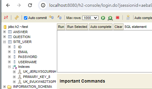 h2-console์ ํ์ธํ๋ฉด Entity๋ก ์ค์ ํ ํ ์ด๋ธ๋ค์ด ์์ฑ๋๊ฒ์ด ํ์ธ๋๋ค.