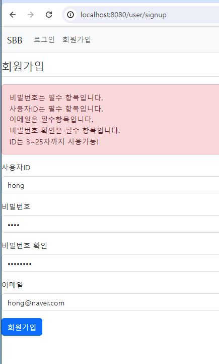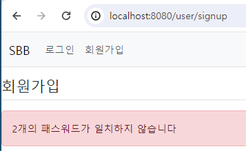 result.rejectValue("password2", "passwordInCorrect","2๊ฐ์ ํจ์ค์๋๊ฐ ์ผ์นํ์ง ์์ต๋๋ค");