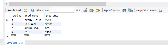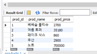 INSERT INTO Products (prod_name, prod_price) values ('우산', 2900);