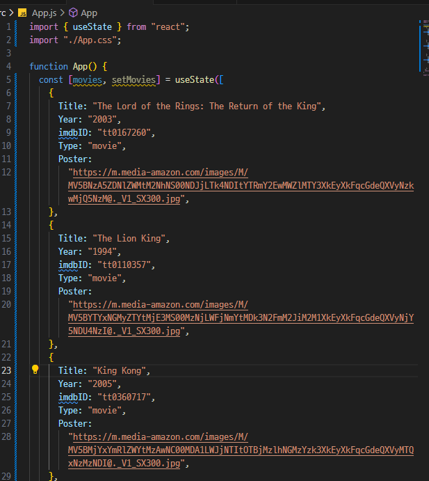 useState를 사용해서 포스트맨에서 가져온 영화 초기값을 가져온다.