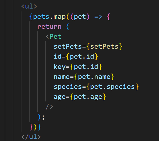 이 함수의 주요 목적은 props.id와 각 pet의 id를 비교하여 props.id와 일치하지 않는(pet를 삭제해야 할 대상이 아닌) 모든 pet을 포함하는 새로운 배열을 생성하는 것이다.