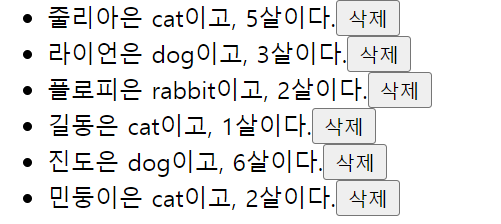 이제 추가된 각 동물의 목록(Pet 컴포넌트) 에 삭제 버튼을 추가하여
