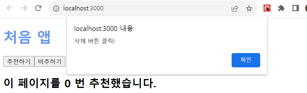 handleDelete함수는 삭제 버튼 클릭! 이라는 메세지를 담은 alert창을 띄운다.