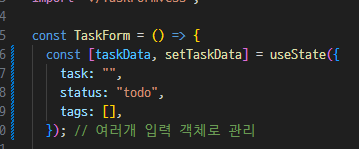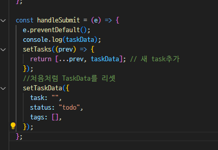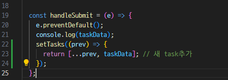 TaskForm으로 setTasks 함수를 전달해서 Form에 새 taskData를 만들면