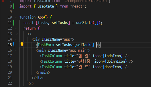 App.jsx에서 TaskColumn의 props에 새로 추가된 tasks와 상태를 추가한다.
