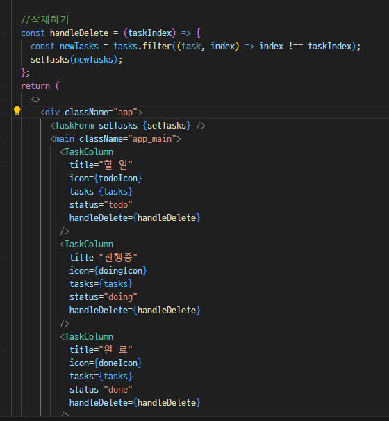 TaskColumn 컴포넌트에 handleDelete props를 내려준다.