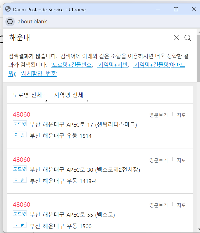 아래의 검색 창이 팝업으로 뜬다. 그리고 주소를 선택하면