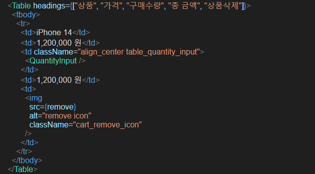 <Table headings={["상품", "가격", "구매수량", "총 금액", "상품삭제"]}>