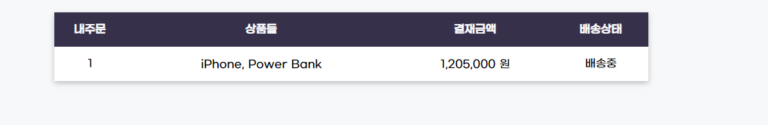<Table headings={["๋ด์ฃผ๋ฌธ", "์ํ๋ค", "๊ฒฐ์ฌ๊ธ์ก", "๋ฐฐ์ก์ํ"]}>