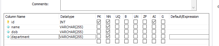 String sql = "INSERT INTO employee(name, department, dob) VALUES(?,?,?)";
