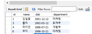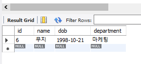 insert into employee(name,dob,department) values("라이언","1988-07-21","개발부");