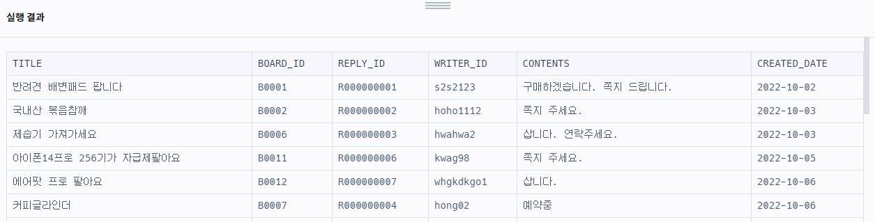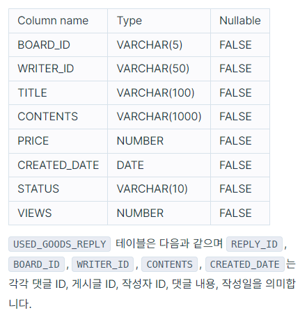 ๋ค์์ ์ค๊ณ ๊ฑฐ๋ ๊ฒ์ํ ์ ๋ณด๋ฅผ ๋ด์ USED_GOODS_BOARD ํ ์ด๋ธ๊ณผ ์ค๊ณ ๊ฑฐ๋ ๊ฒ์ํ ์ฒจ๋ถํ์ผ ์ ๋ณด๋ฅผ ๋ด์ USED_GOODS_REPLY ํ ์ด๋ธ์ ๋๋ค. USED_GOODS_BOARD ํ ์ด๋ธ์ ๋ค์๊ณผ ๊ฐ์ผ๋ฉฐ BOARD_ID, WRITER_ID, TITLE, CONTENTS, PRICE, CREATED_DATE, STATUS, VIEWS์ ๊ฒ์๊ธ ID, ์์ฑ์ ID, ๊ฒ์๊ธ ์ ๋ชฉ, ๊ฒ์๊ธ ๋ด์ฉ, ๊ฐ๊ฒฉ, ์์ฑ์ผ, ๊ฑฐ๋์ํ, ์กฐํ์๋ฅผ ์๋ฏธํฉ๋๋ค.