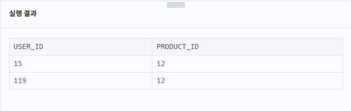 3. ORDER BY USER_ID๋ ์ค๋ฆ์ฐจ ์์ด๋ผ ASC ์๋ต / USER_ID๊ฐ ๊ฐ์ ๊ฒฝ์ฐ PRODUCT_ID ๋ก DESC(๋ด๋ฆผ์ฐจ ์)