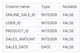 ๋ค์์ ์ด๋ ์๋ฅ ์ผํ๋ชฐ์ ์จ๋ผ์ธ ์ํ ํ๋งค ์ ๋ณด๋ฅผ ๋ด์ ONLINE_SALE ํ ์ด๋ธ ์ ๋๋ค. ONLINE_SALE ํ ์ด๋ธ์ ์๋์ ๊ฐ์ ๊ตฌ์กฐ๋ก ๋์ด์์ผ๋ฉฐ ONLINE_SALE_ID, USER_ID, PRODUCT_ID, SALES_AMOUNT, SALES_DATE๋ ๊ฐ๊ฐ ์จ๋ผ์ธ ์ํ ํ๋งค ID, ํ์ ID, ์ํ ID, ํ๋งค๋, ํ๋งค์ผ์ ๋ํ๋ ๋๋ค.