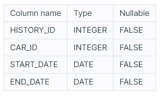 다음은 어느 자동차 대여 회사의 자동차 대여 기록 정보를 담은 CAR_RENTAL_COMPANY_RENTAL_HISTORY 테이블입니다. CAR_RENTAL_COMPANY_RENTAL_HISTORY 테이블은 아래와 같은 구조로 되어있으며, HISTORY_ID, CAR_ID, START_DATE, END_DATE 는 각각 자동차 대여 기록 ID, 자동차 ID, 대여 시작일, 대여 종료일을 나타냅니다.