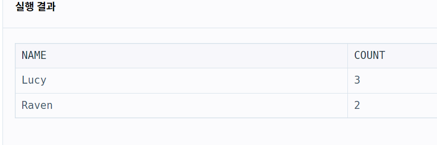 ** GROUP BY로 NAME별로 집계함 , HAVING으로 카테고리 별 개수가 2개 이상이여야 조회하도록 필터링함