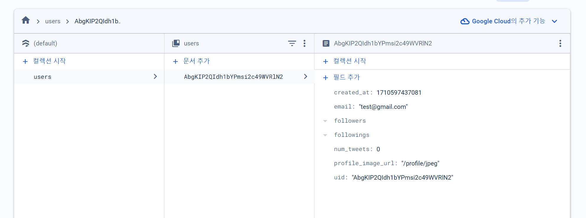 성공 시 아래와 같이 firestore에 정상적으로 추가됨을 확인할 수 있다.