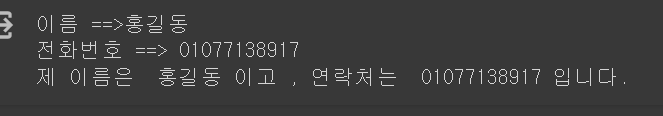 print("제 이름은 ", userName, "이고 , 연락처는 ",userPhone,"입니다.")