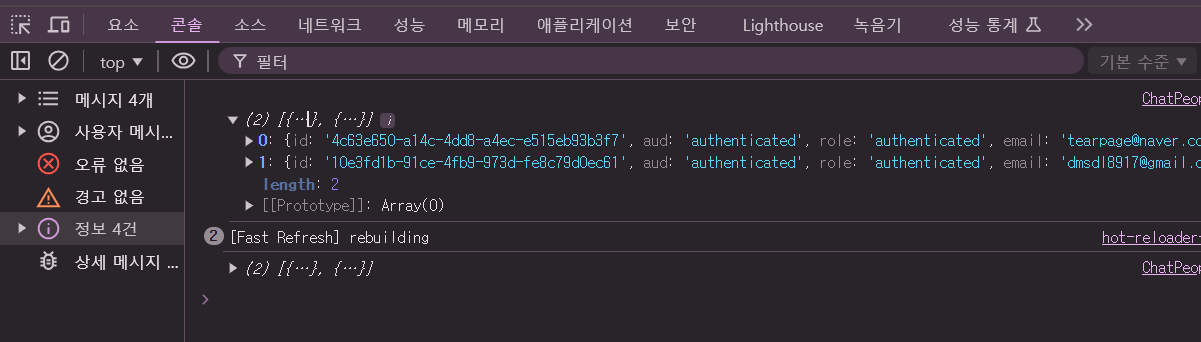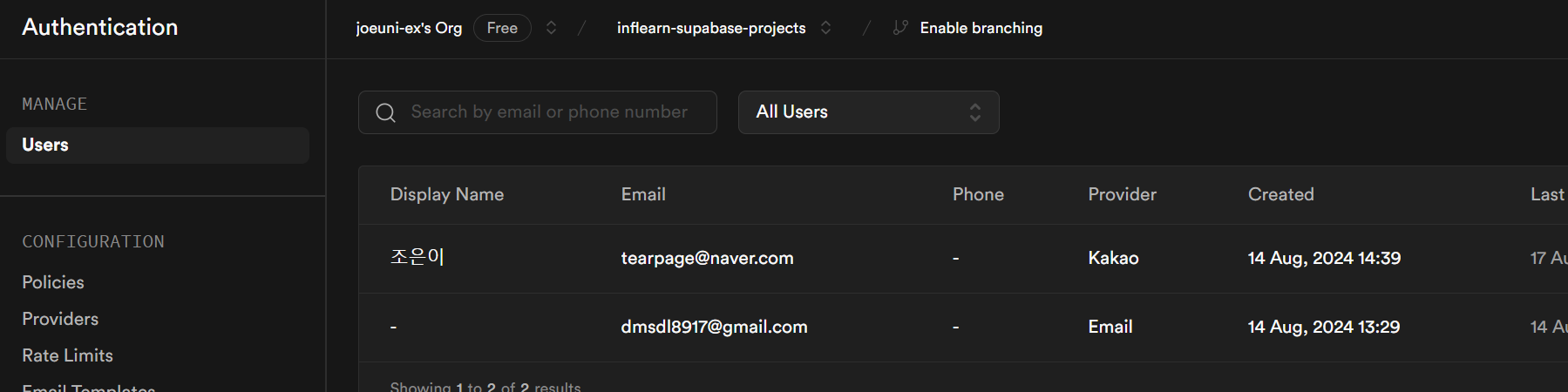 supabase의 유저와 맞게 두명의 유저가 출력되는 것을 확인 가능하다.