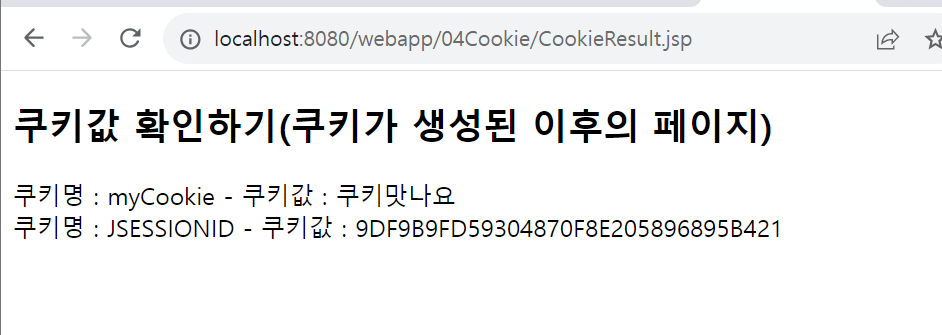 <h2>쿠키값 확인하기(쿠키가 생성된 이후의 페이지)</h2>