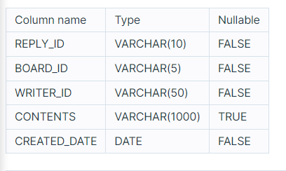 USED_GOODS_REPLY ํ ์ด๋ธ์ ๋ค์๊ณผ ๊ฐ์ผ๋ฉฐ REPLY_ID, BOARD_ID, WRITER_ID, CONTENTS, CREATED_DATE๋ ๊ฐ๊ฐ ๋๊ธ ID, ๊ฒ์๊ธ ID, ์์ฑ์ ID, ๋๊ธ ๋ด์ฉ, ์์ฑ์ผ์ ์๋ฏธํฉ๋๋ค.