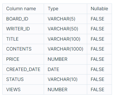๋ค์์ ์ค๊ณ ๊ฑฐ๋ ๊ฒ์ํ ์ ๋ณด๋ฅผ ๋ด์ USED_GOODS_BOARD ํ ์ด๋ธ๊ณผ ์ค๊ณ ๊ฑฐ๋ ๊ฒ์ํ ์ฒจ๋ถํ์ผ ์ ๋ณด๋ฅผ ๋ด์ USED_GOODS_REPLY ํ ์ด๋ธ์ ๋๋ค. USED_GOODS_BOARD ํ ์ด๋ธ์ ๋ค์๊ณผ ๊ฐ์ผ๋ฉฐ BOARD_ID, WRITER_ID, TITLE, CONTENTS, PRICE, CREATED_DATE, STATUS, VIEWS์ ๊ฒ์๊ธ ID, ์์ฑ์ ID, ๊ฒ์๊ธ ์ ๋ชฉ, ๊ฒ์๊ธ ๋ด์ฉ, ๊ฐ๊ฒฉ, ์์ฑ์ผ, ๊ฑฐ๋์ํ, ์กฐํ์๋ฅผ ์๋ฏธํฉ๋๋ค.