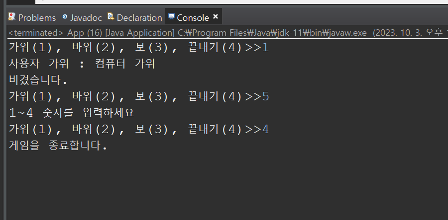 System.out.println("์ฌ์ฉ์๊ฐ ์ด๊ฒผ์ต๋๋ค.");