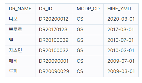 ๋ค์์ ์ข ํฉ๋ณ์์ ์ํ ์์ฌ ์ ๋ณด๋ฅผ ๋ด์DOCTOR ํ ์ด๋ธ์ ๋๋ค. DOCTOR ํ ์ด๋ธ์ ๋ค์๊ณผ ๊ฐ์ผ๋ฉฐ DR_NAME, DR_ID, LCNS_NO, HIRE_YMD, MCDP_CD, TLNO๋ ๊ฐ๊ฐ ์์ฌ์ด๋ฆ, ์์ฌID, ๋ฉดํ๋ฒํธ, ๊ณ ์ฉ์ผ์, ์ง๋ฃ๊ณผ์ฝ๋, ์ ํ๋ฒํธ๋ฅผ ๋ํ๋ ๋๋ค.